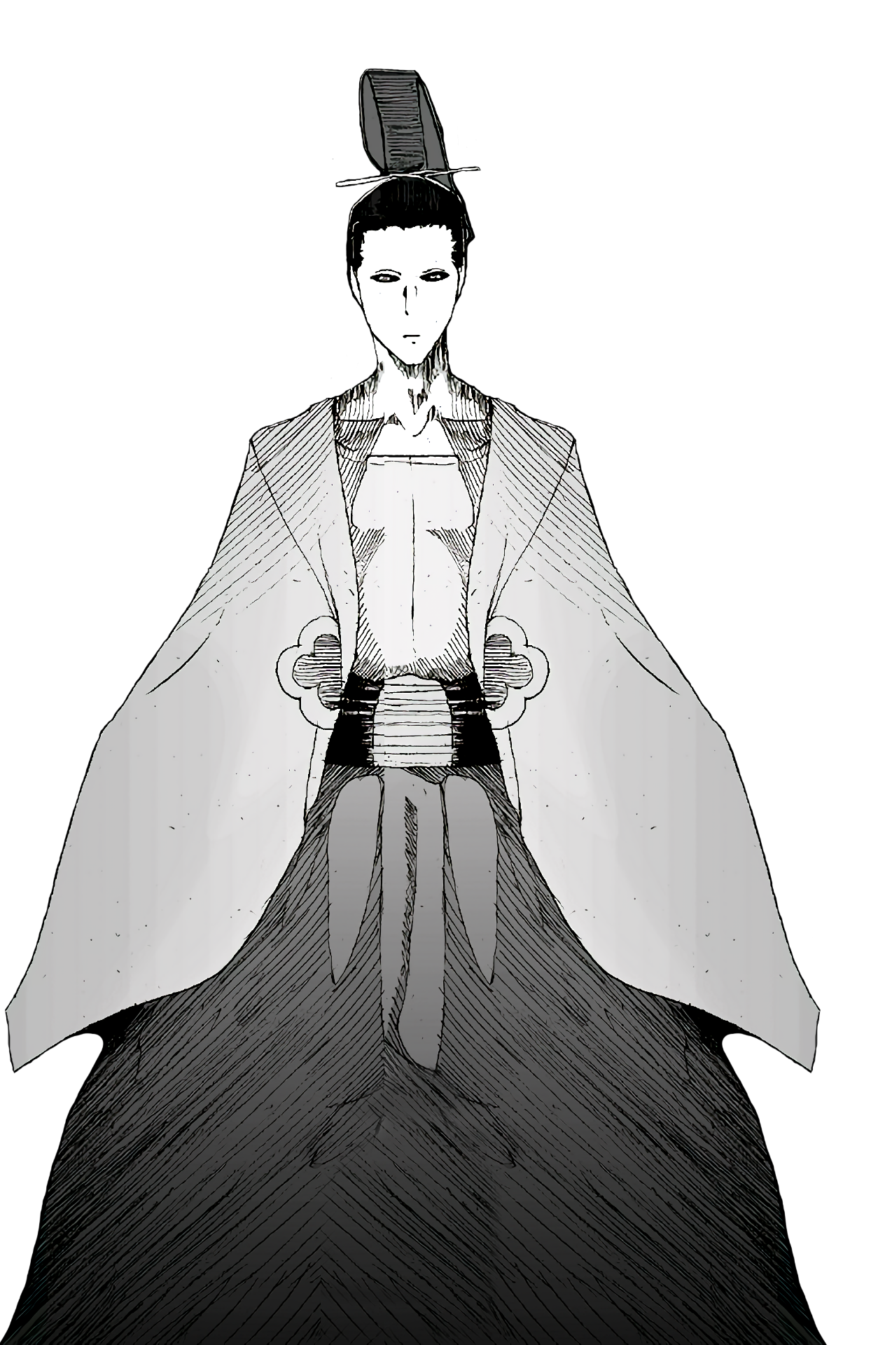 The Soul King is humanoid in physique, with slicked-back dark hair, oval eyes and very thin eyebrows. His eyes are very unusual, each having four black irises.[5][6] He does not have any arms or legs.[7][8] The Soul King is sealed within an unusual barrier that is suspended by four wires in a large, elegant room.The Soul King is not involved in governing Soul Society and never interferes. Most Shinigami have never seen him. To them, he is revered and symbolic, but not present in their lives.The Soul King's sole purpose is to regulate the flow of souls into and out of Soul Society and keep the flow stable. Without the Soul King, the balance is lost and Soul Society, as well as the Dangai, Hueco Mundo, and the Human World, will all collapse into one.[9] According to Yhwach, this results in the unification of life and death and the creation of a world without the fear of death.[10]