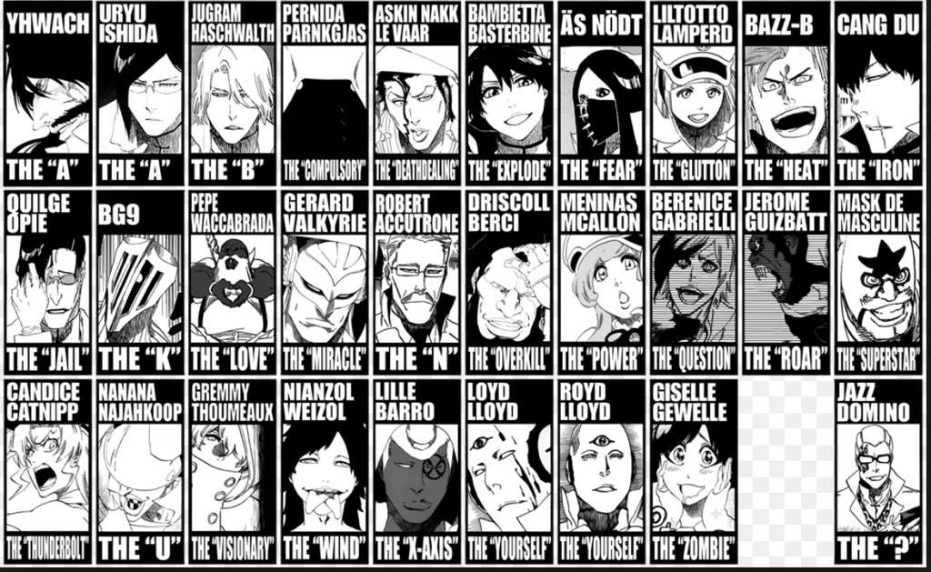 The Sternritter is composed of extremely powerful Quincy. According to Akon, the members that participated in the first invasion of the Seireitei have powers comparable to or greater than that of a Captain-level Shinigami.[3] Each member is assigned a Schrift by Yhwach, who bestows them abilities.[4][5] The Schrifts are based off of English words and letters.